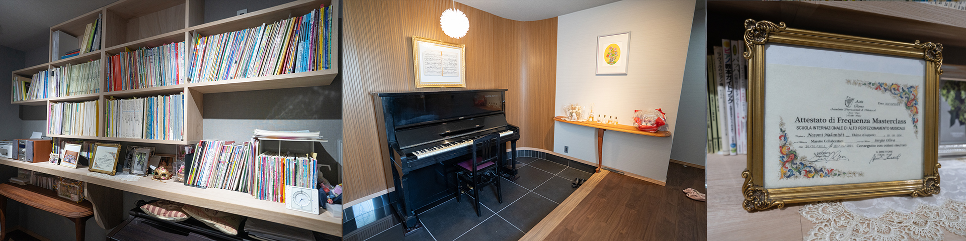 玄関ロビーではアップライトのピアノがお迎えします。実際に演奏もしていただけるようにしています。また私が若かりし頃に何度も見返し、メモを加え、一生懸命レッスンした思い出の楽譜を飾っています。