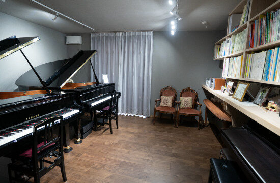 広々とした専用の教室には調律師によって最適にチューニングされたグランドピアノが2台あります。良質の環境でピアノをどんどん好きになってもらいたいと思います。