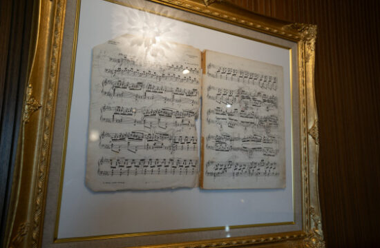 玄関ロビーではアップライトのピアノがお迎えします。実際に演奏もしていただけるようにしています。また私が若かりし頃に何度も見返し、メモを加え、一生懸命レッスンした思い出の楽譜を飾っています。